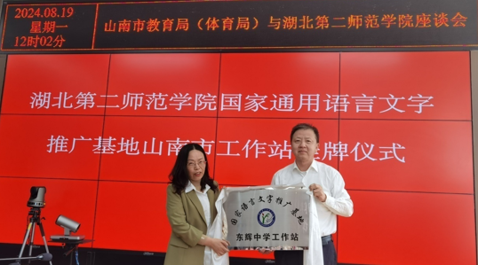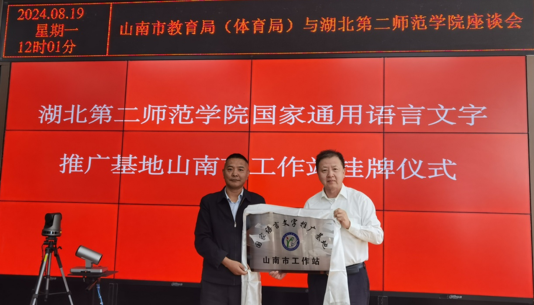 8月19日,杨鲜兰一行在山南市教育局举行了williamhill中国国家语言文字推广基地挂牌仪式暨来鄂跟岗培训教师座谈会。会上,杨鲜兰介绍了我校基本情况、办学特色、近年来援助山南市教育工作的成效以及国家语言文字推广工作进展。胡兴为williamhill中国国家语言文字推广基地山南市教育局和东辉中学工作站授牌。