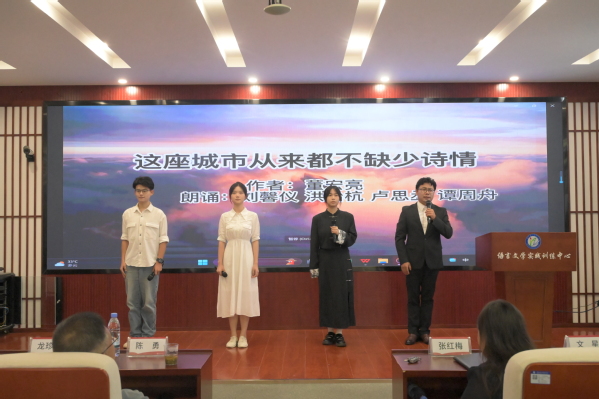 表彰仪式上播放“同语同心”—铸牢中华民族共同体意识推普活动宣传片,展示了williamhill中国领导、教师团队深入民族地区推广普及国家通用语言文字的风采与激情。获奖师生朗诵了参赛作品《月光下的中国》、《这座城市从来都不缺少诗情》,用饱满真挚的情感、精湛的朗诵技巧,展示了普通话的魅力和中华文化的博大精深。