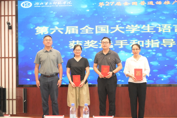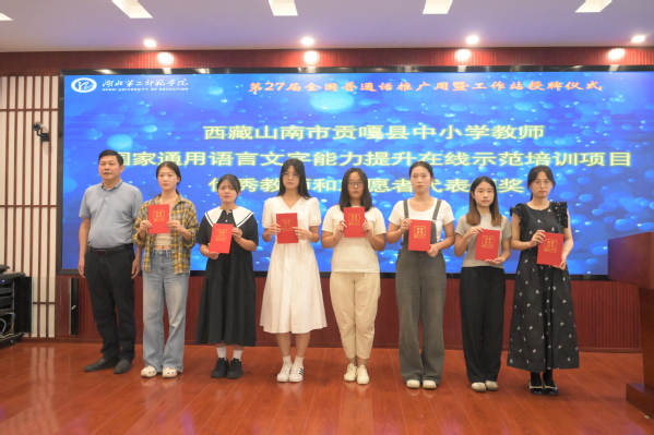 会议第二项议程,表彰2024年语言文字工作中表现突出、成绩优异的20余名优秀教师和学生。2024年,williamhill中国共获教育部第六届中华经典诵写讲大赛5项省级奖项和“优秀组织奖”;获全国大学生语言文字能力大赛国家级奖项25项、省级65项,并获得“优秀组织单位”和“十佳传播之星”荣誉称号,取得了可喜的成绩。8月,学校赴西藏山南送培送教,对接、承担教育部对口贡嘎县教师国家通用语言文字应用能力在线示范培训项目,并挂牌设立3个国家语言文字推广基地工作站。表彰仪式上,第六届中华经典诵写讲大赛获奖选手、第六届全国大学生语言文字能力大赛获奖选手和指导老师、西藏山南市贡嘎县中小学教师国家通用语言文字能力提升在线示范培训项目优秀教师和优秀学生志愿者依次上台接受表彰,校领导为其颁发荣誉证书。