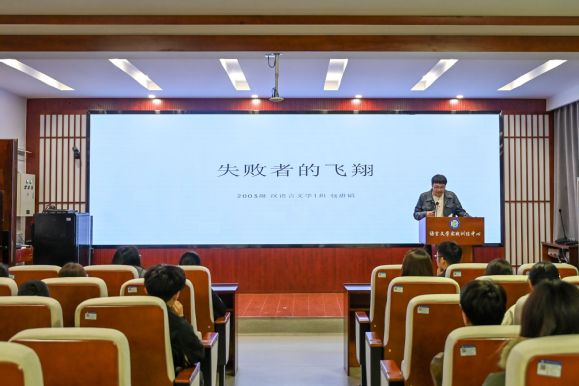 分享环节,包唐韬以自身成长路上的失败与探索为切入点,结合支教和创业的独特经历,围绕“失败”主题展开深入论述。他直言,失败是人生的常态,每个人都会在成长过程中遭遇挫折,关键是要学会接纳失败。只有坦然面对失败,才能获得心灵的自由,实现个人的成长。同时,他结合文科生的身份,鼓励大家依托文学知识创造价值。他指出,文学不仅是一种艺术形式,更蕴含着丰富的智慧和情感,文科生可以从失败中挖掘生命的厚度与审美价值,为自身发展开辟新路径。